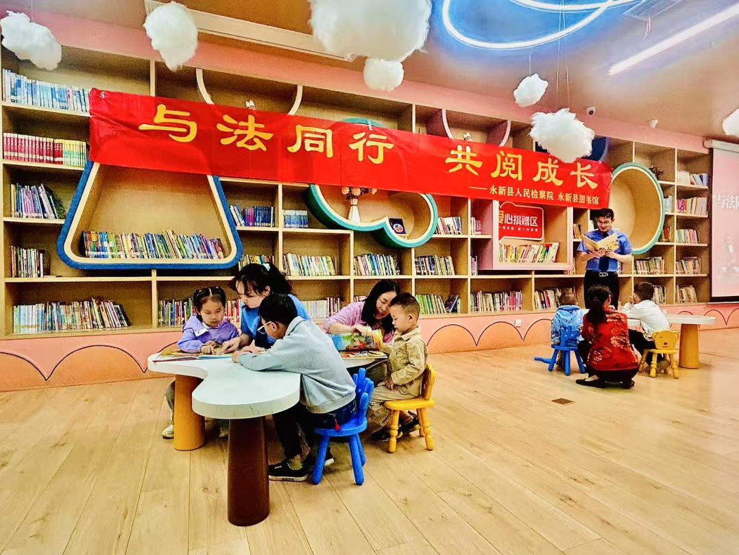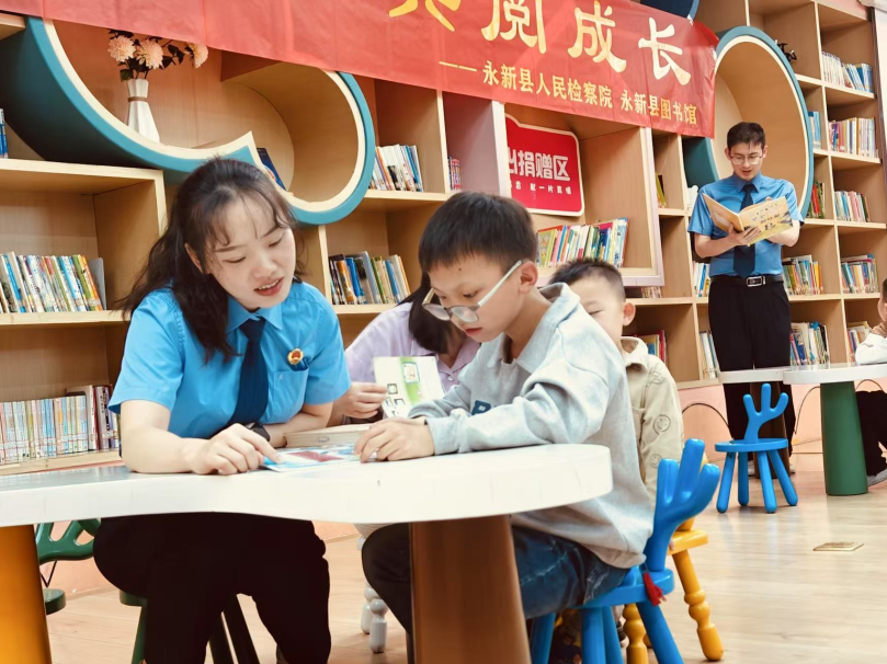 第30个“世界读书日”到来之际,永新县人民检察院联合永新县图书馆,启动“与法同行、共阅成长”系列普法活动。来自县检察院“新未来工作室”的检察干警走进县图书馆“欧洲城文化驿站”,和孩子们一起阅读课外书籍和法律读本,讲解未成年人保护知识,增强小朋友自护能力。